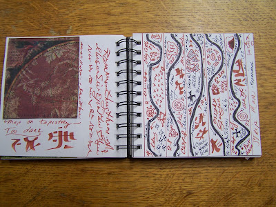 These last two small journal pages are experiments in various imaginary writing types and styles, and forms of maps, all done as ideas for a book I am currently writing titled The Map. The last page on the right is based on old English strip maps. The black lines are the road, and you follow it from top to bottom, then jump to the next strip and keep going, reading it left to right.
